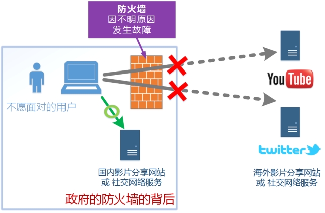某些国家的防火墙由于 "未知故障" 导致通信失败。例如,你在某一国家旅行,并尝试访问 YouTube,